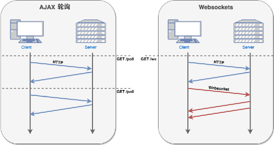 上图为 ajax 轮询与 webscokets 实现的方式对比图,从图中可以看出 ajax 轮询是在特定的的时间间隔(如每1秒),由浏览器对服务器发出 HTTP 请求,然后由服务器返回最新的数据给客户端的浏览器。这种传统的模式带来很明显的缺点,即浏览器需要不断的向服务器发出请求,然而 HTTP 请求可能包含较长的头部,其中真正有效的数据可能只是很小的一部分,显然这样会浪费很多的带宽等资源。