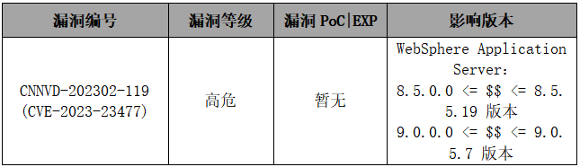 近日,嘉诚安全监测到IBM官方发布了IBM WebSphere Application Server远程代码执行漏洞的安全风险通告,漏洞编号为:CNNVD-202302-119(CVE-2023-23477)。