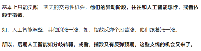 只能交易小轮动预期,如,赚的是从调整→上涨的钱,而AI地位削弱后,后期可以尝试赚,从上涨→大涨的钱,类似固态电池的昨天(小涨)和今天(大涨)。