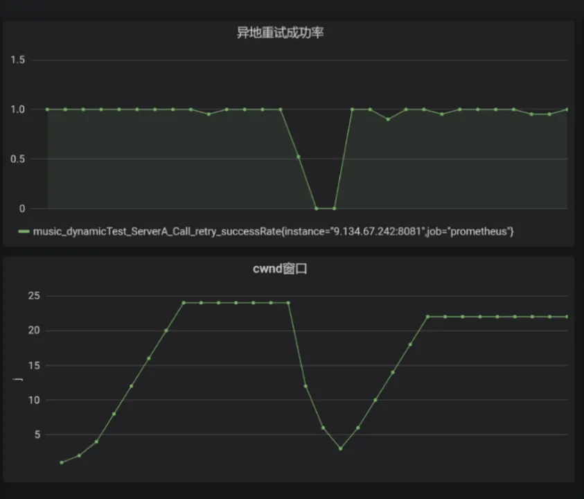 // 设第 i 次探测的窗口为 f(i),实际探测量为 g(i),第 i 次探测的成功率为 s(i),第 i 次本地总请求数为 t。// 那么第 i+1 次探测的窗口为 f(i+1),取值如下:if s(i) = [98%, 100%] // 第 i 次探测成功率 >= 98%,探测正常if g(i) >= f(i) // 如果第 i 次实际探测量等于当前窗口,增大第 i+1 次窗口大小f(i+1) = f(i) + max (min ( 1% * t, f(i) ) , 1)elsef(i+1) = f(i) // 如果第 i 次实际探测量小于当前窗口,第 i+1 次探测窗口维持不变elsef(i+1) = max(1,f(i)/2) // 如果第 i 次探测异常,第 i+1 次窗口退避置 1// 其中,重试窗口即 f(i) 初始大小为 1。算法中参数及细节,根据实际测试和线上效果进行调整。