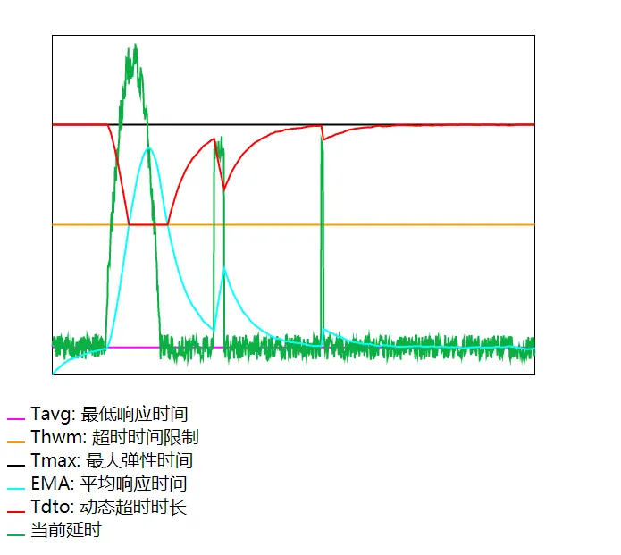 如下图,当平均响应时间(EMA)大于超时时间限制(Thwm),说明平均情况表现很差,动态超时时长(Tdto)就会趋近至超时时间限制(Thwm),降低弹性。当平均响应时间(EMA)小于超时时间限制(Thwm),说明平均情况表现很好,动态超时时长(Tdto)就可以超出超时时间限制(Thwm),但会低于最大弹性时间(Tmax),具备一定的弹性。