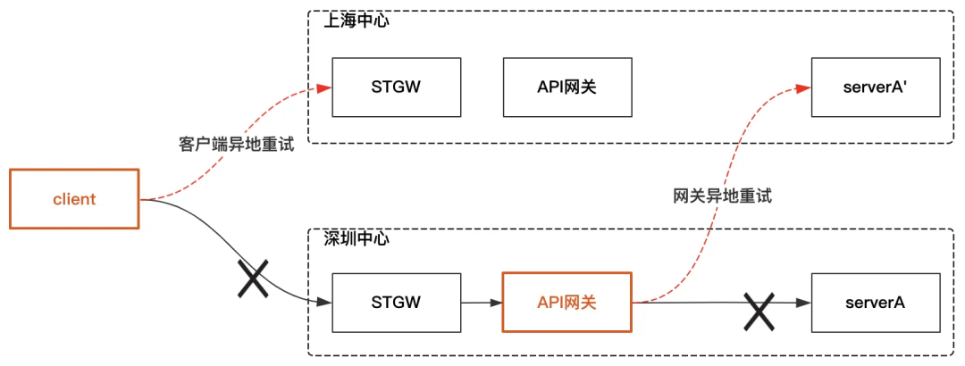当客户端未收到响应时,说明API网关异常或者网络不通,客户端重试异地。当客户端收到响应,而http状态码为5xx,说明API网关异常,客户端重试异地。当http状态码正常,说明API网关正常,此时即使API失败也不重试。