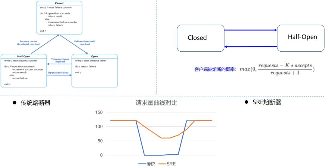 传统熔断器实现Closed、Half Open、Open三个状态,当进入Open状态时会拒绝所有请求,而进入Closed状态时瞬间会有大量请求,服务端可能还没有完全恢复,会导致熔断器又切换到Open状态,一种比较刚性的熔断策略。SRE熔断只有打Closed和Half-Open两种状态,根据请求成功率自适应地丢弃请求,尽可能多地让请求成功请求到服务端,是一种更弹性的熔断策略。QQ音乐采用更弹性的SRE熔断器: