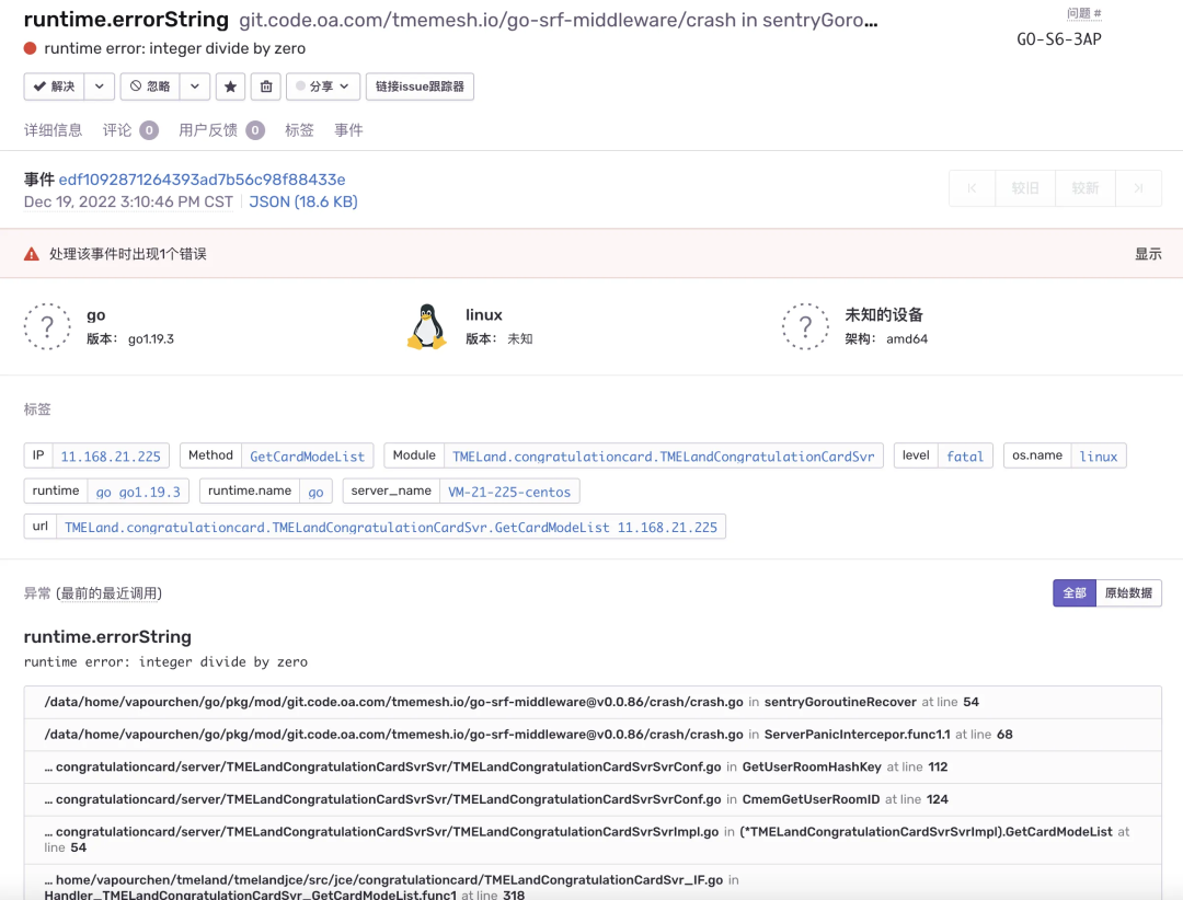 传统的方式是在进程崩溃时把进程内存写入一个镜像中以供分析,或者把panic信息写到日志中。core dumps的方式在容器环境中实施困难,panic信息写入日志则容易被其他日志冲掉且感知太弱。QQ音乐使用的方式是在RPC框架中以拦截器的方式注入,发生panic后上报到sentry平台。