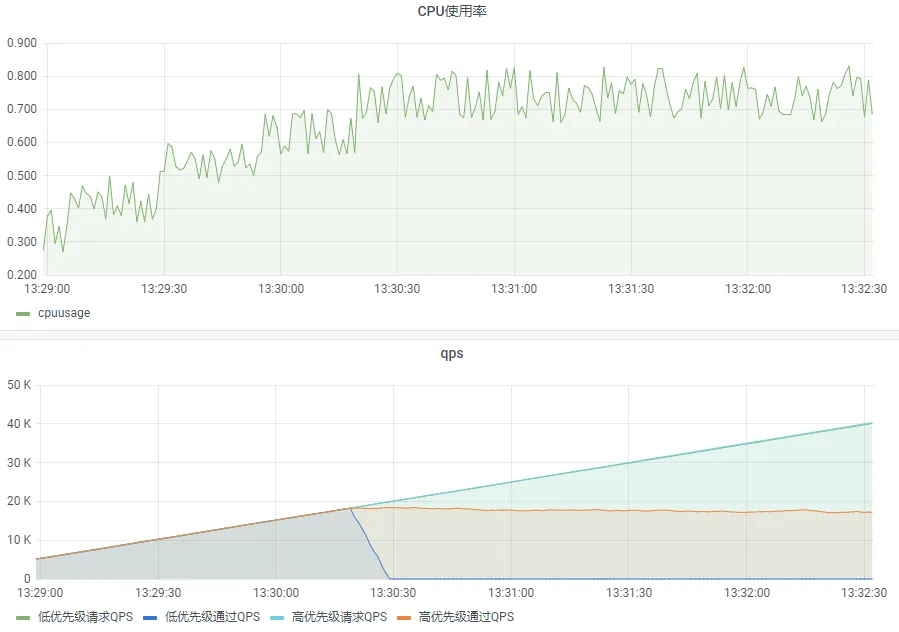 效果如下图,网关高负载时,2级、3级、4级服务丢弃,只有1级服务通过。
