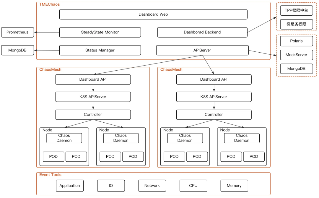 TMEChaos APIServer:TMEChaos的逻辑组件,主要负责服务维度的爆炸半径设置,ChaosMesh多集群管理、实验状态管理、Mock行为注入。