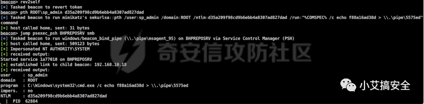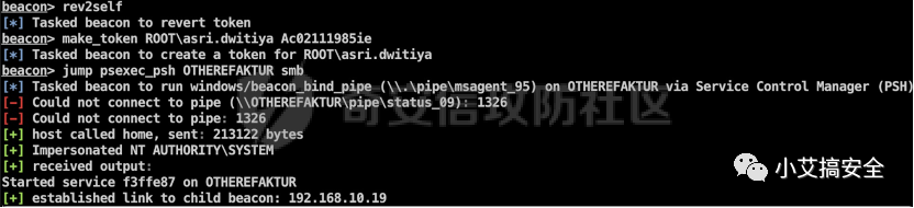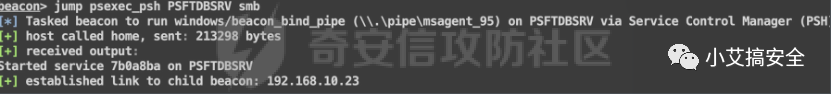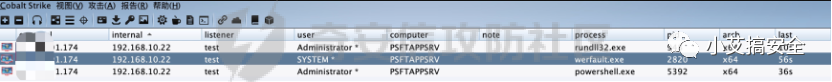 建立好SMB Beacon监听,尝试进行横向,利用明文密码或者hash让机器上线SMB Beacon,这里利用的是psexec_psh