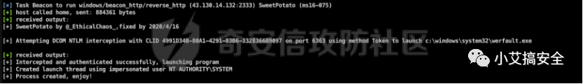 因为当前是一个Administrator权限,当前主机补丁打得也比较少,所以这里尝试利用甜土豆提权到system,提权成功反弹回来一个system权限的会话