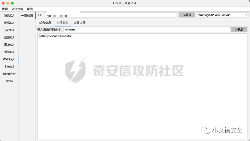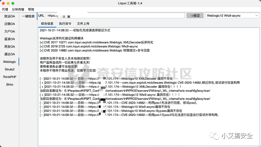 Weblogic12存在 Wls9-async漏洞和 XMLDecoder漏洞,这里直接利用漏洞利用工具验证,漏洞存在。