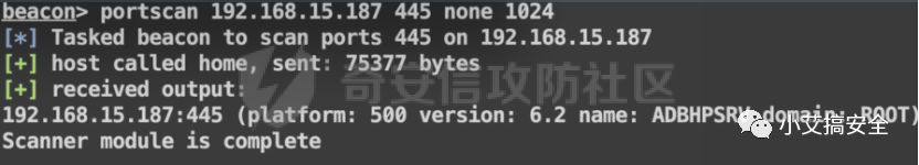 在域中,默认域用户是可以登录到除域控以外的所有主机。当我们得到其中一个域用户的账号密码,所以我们可以利用该域用户与其他主机建立IPC连接,然后让其他主机进行SMB Beacon上线,于是批量扫了下445开放的主机