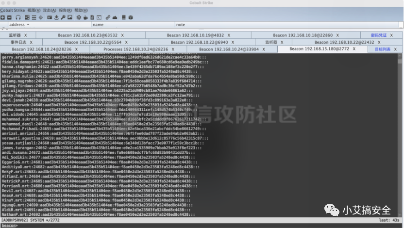 利用SMB Beacon成功上线后,后面就会有 ∞∞ 这个字符,这就是派生的SMB Beacon,之后再在这台机子抓hash