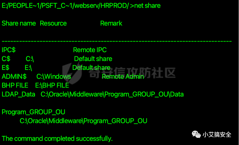 默认共享是为了方便管理员远程管理而默认开启的共享,我们通过IPC连接可以实现对这些默认共享的访问。可以通过net share命令查看,前期信息收集时,就已经查看过当前主机是开启了默认共享的。