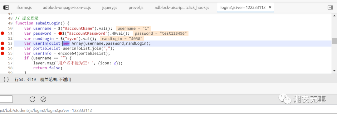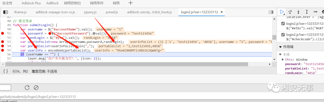 然后直接点登录,你会发现他直接跳到断点的地方了,而且还很清晰的看出来这些用户名和密码是怎么加密的