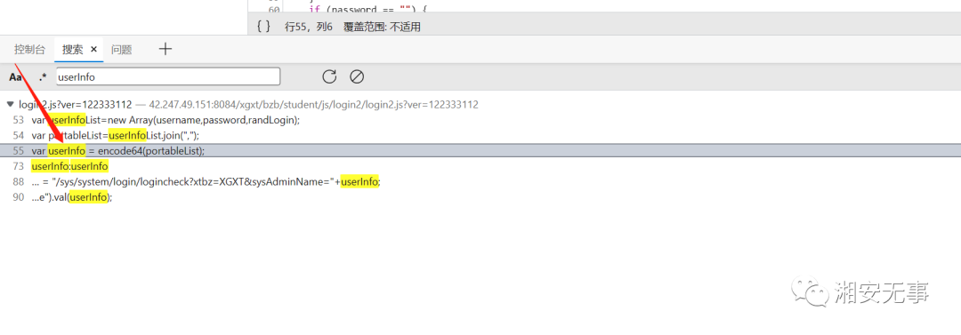 为什么要调试?主要为了找出js里面加密的主要函数,然后用python去调用加密函数对你的字典加密,然后就可以爆破了。首先搞清楚是哪个字段加密,userInfo是加密的,那我们就搜索关键字。