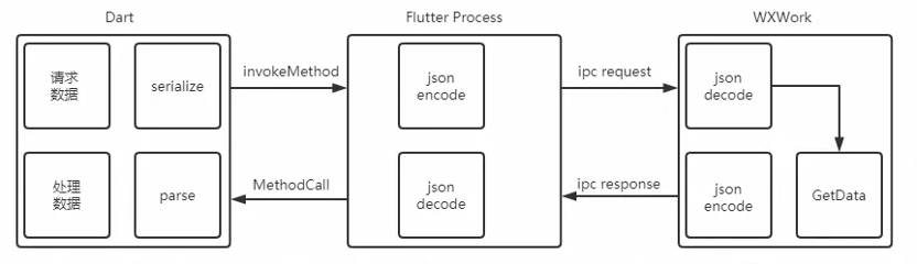 final result = await service.getGovernMyReportListFromServer(req);在 windows 上,为了减少与主工程的耦合性,我们将 Flutter 插件作为独立的进程运行,跟其他端不一样的是, Flutter 与 原生工程的通信方式会有一些改变,包括我们的 channel 以及 底层的调用,因此我们在企业微信的 ipc 通信的基础上,实现了 channel/dart2cpp 的通信,具体的调用流程如下: