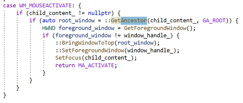 解决方案:在 Flutter 窗口收到鼠标激活消息时(WM_MOUSEACTIVATE),将该窗口对应的 Ancestor 窗口前置。