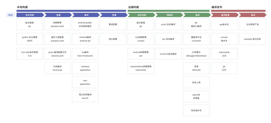 整个企业微信客户端包含跨平台部分,代码量级超 1500 万行。客户端本地模块和业务的数量达到了上百个,相关页面超过 2000 个。企业微信接入 Flutter 之后,会影响到各端的编译流程和依赖结构,但是要保障现有的开发模式不受影响,并且提供一套完整的自动化以及容器化的方案。同时面对各端的复杂编译环境(gradle、bazel、xcode、cmake)同时保障 Flutter 环境的高效开发以及编译的稳定性,面对这个巨大体量的工程,为我们接入 Flutter 带来了一定的困难。