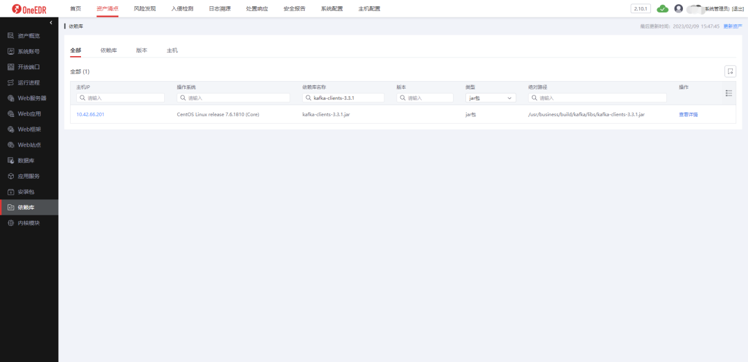 微步在线 OneEDR 用户可以通过在资产清点-依赖库中搜索 kafka-clients-【版本号】.jar 寻找主机上存在漏洞的 jar 包: