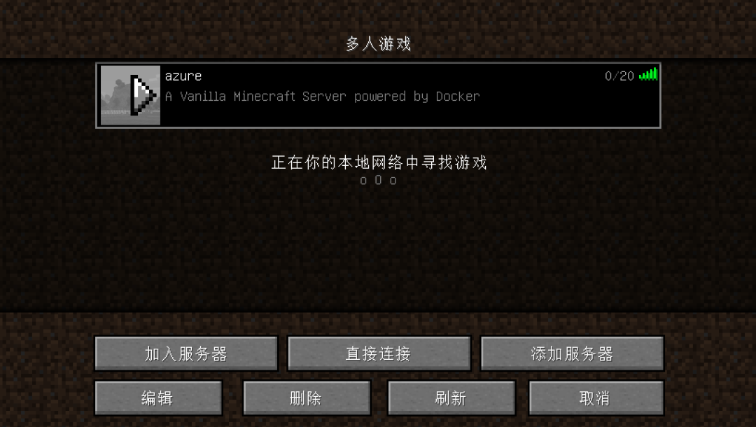 启动客户端,在多人游戏中添加服务器:地址是虚拟机的公共 IP,端口是 Service 的 NodePort。