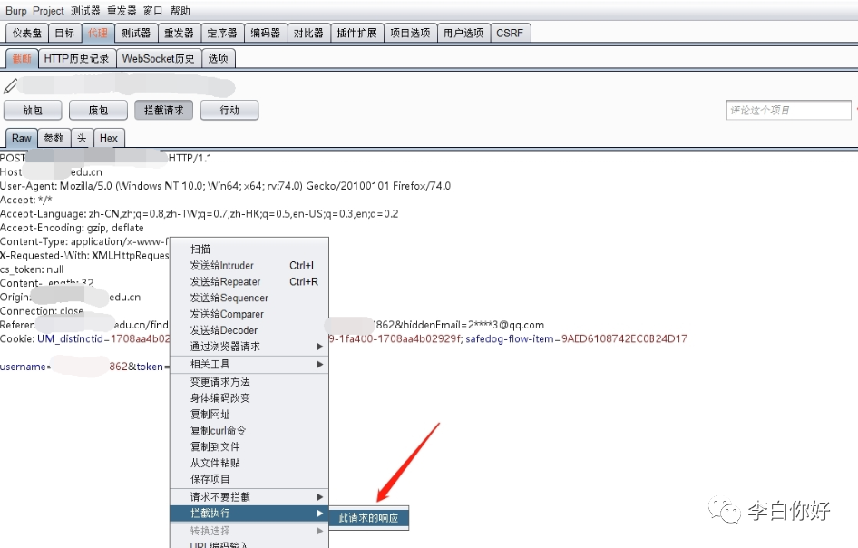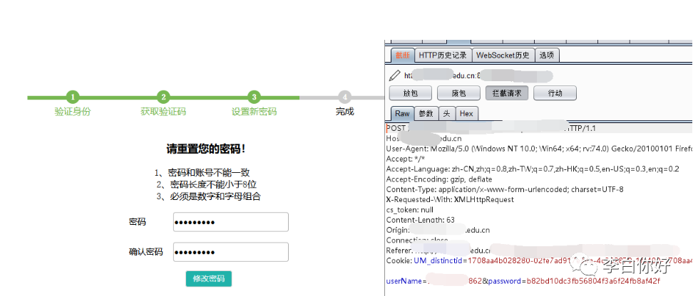 看到了邮箱,保存下来,作为一个信息搜集。然后我退出去,想试试这个系统的忘记密码有没有机会绕过。用的是我已经能登录的学号进行测试