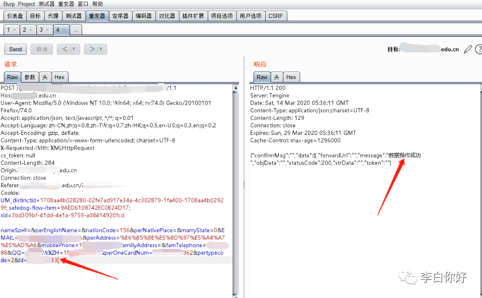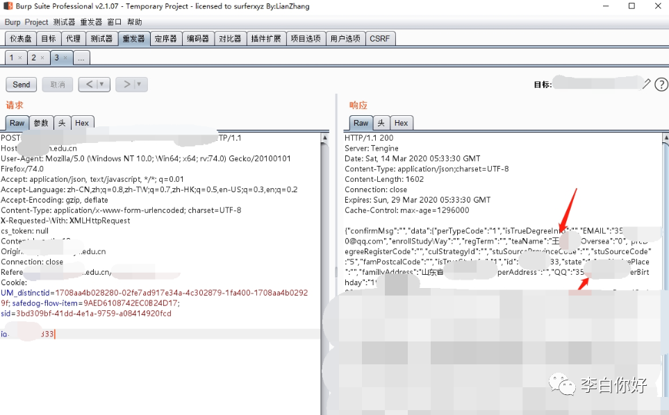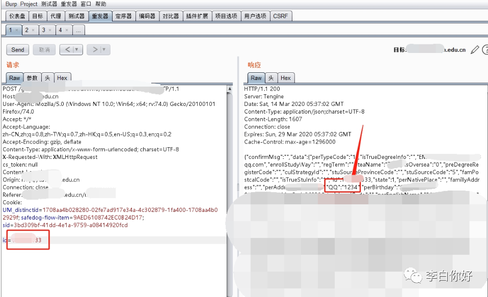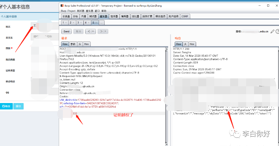 然后我们使用越权查询功能去查看一下信息有没有被我们修改?