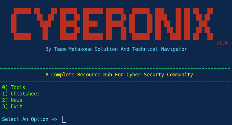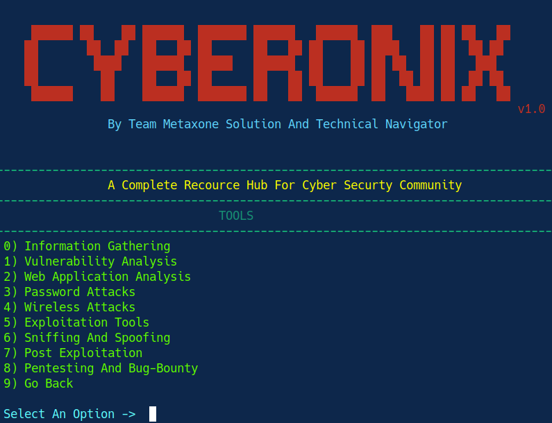 apt update -y && apt full-upgrade -ygit clone https://github.com/TeamMetaxone/Cyberonix.gitcd Cyberonixchmod +x setup.pysudo python3 setup.pycyberonix
