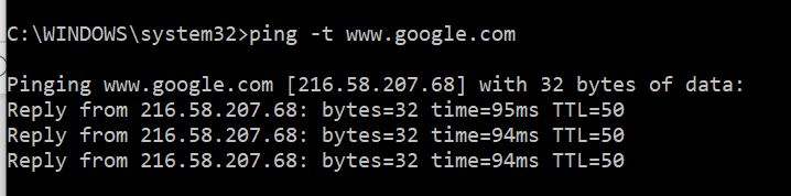 我在排除网络故障时经常使用的 Ping 中最有用的选项之一是使用“ -t ”选项连续发送 ICMP 数据包,如下所示: