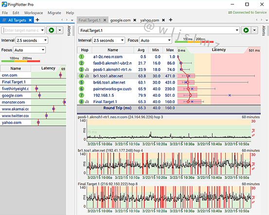 该程序使用 traceroute、ping 和 whois 的独特组合,随时间跟踪网络数据,可以导出和分析这些数据以识别网络问题(随时间推移)、性能问题等。
