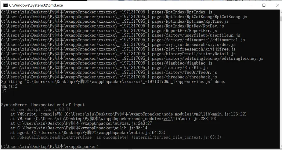 依赖包安装好后 使用命令node wuWxapkg.js C:\xxxxxx\xxxxxx\_-1971317095_1.wxapkg