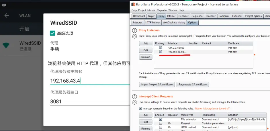步骤1: 配置Burp和模拟器(模拟器需导入ca证书),打开模拟器的WLAN-->高级设置-->输入物理机的ip以及一个没被占用的端口,Burp用于代理该端口