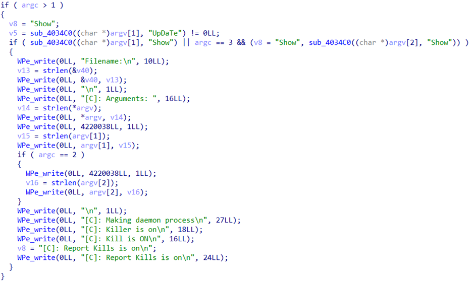 样本支持带参数运行,"Show" 参数可在样本运行时输出一些显示运行状态的Debug字符串,"UpDaTe" 参数可对样本进行升级: