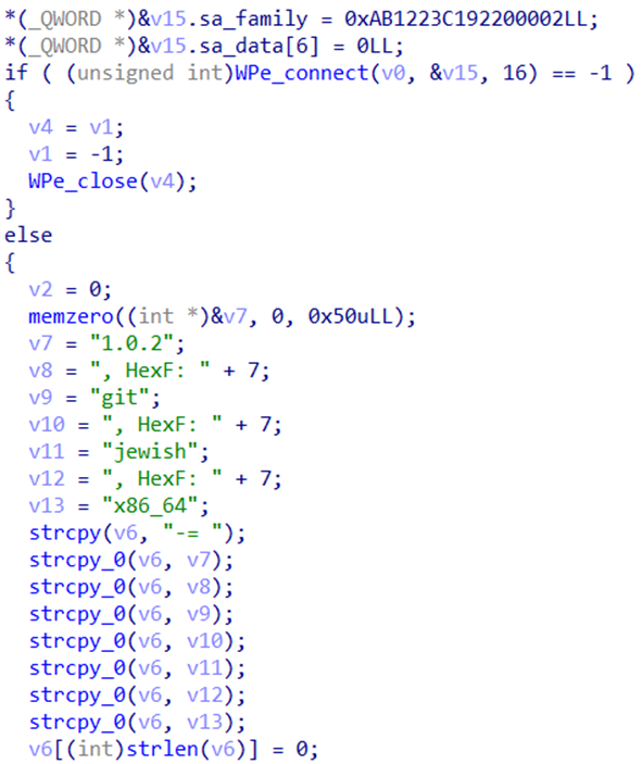 该版本中,单例运行的方式修改为判断网络通信是否有C2,并且上线包中会携带样本的版本信息 "1.0.x"。