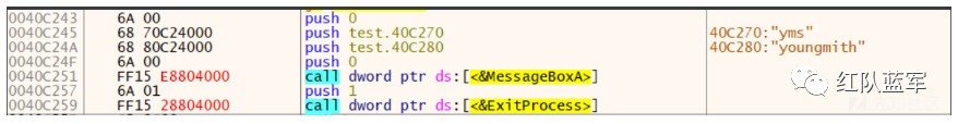 正常的传参以及调用MessageBoxA和ExitProcess,其中MessageBoxA的字符串参数放在40C270和40C280处。