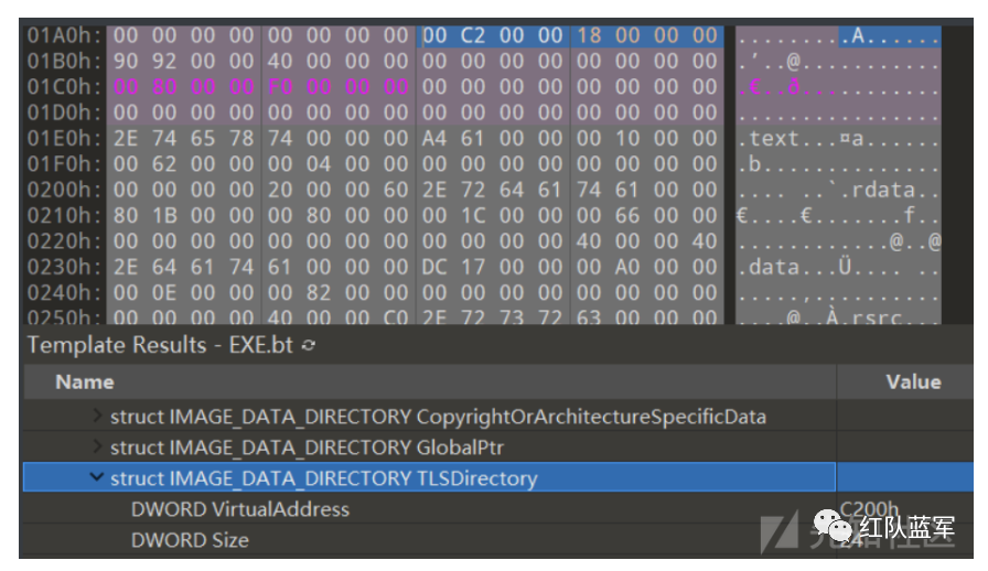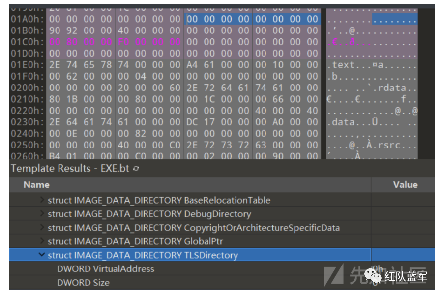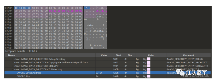 这里的VirtualAddress指向的RVA是0x9310(对应RAW为0x7910)这个指针实际上是指向一个结构体:IMAGE_TLS_DIRECTORY