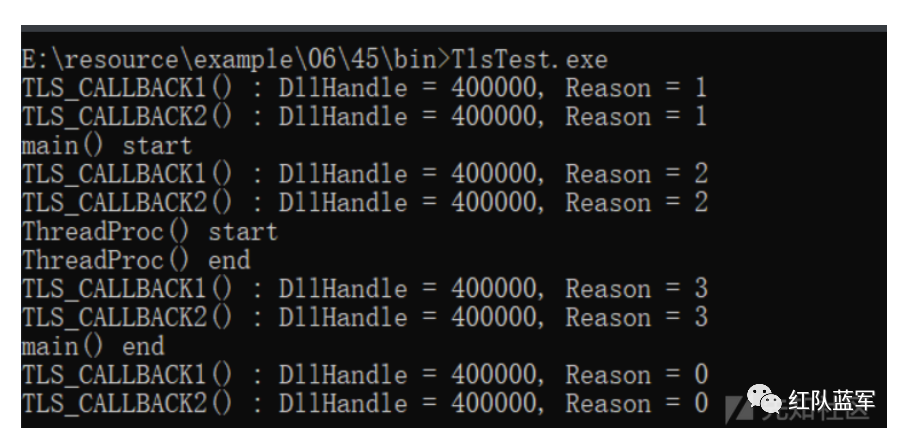 根据这里的Reason值可以直观的看见TLS回调函数被执行的时间点:主线程创建时(DLL_PROCESS_ATTACH),子线程创建时(DLL_THREAD_ATTACH),子线程结束时(DLL_THREAD_DETACH),主线程结束时(DLL_PROCESS_DETACH)