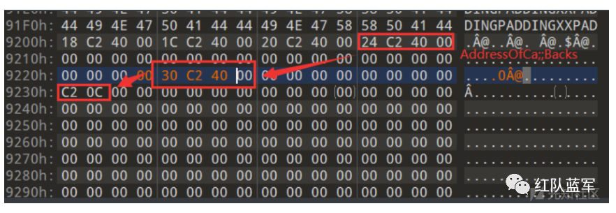 由于本PE文件的ImageBase是0x40000000,这个节区的VA是C000,所以这里的数据都是以04C2开头的