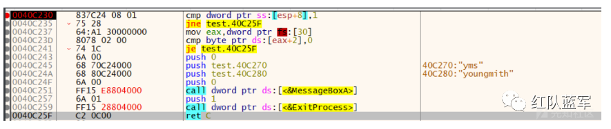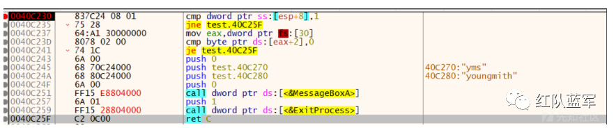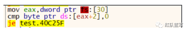 这组指令是获取PEB.BeingDebugged成员,并比较其是否为0(即判断程序是否处于调试状态),如果不是则直接跳转至TLS回调函数结束。