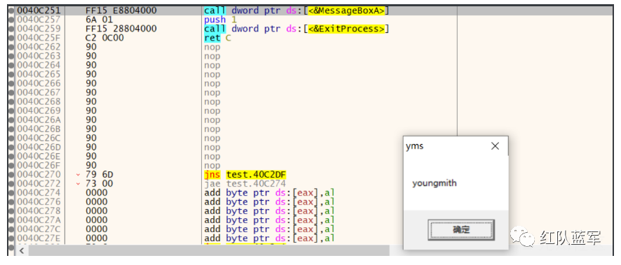 特别注意:这里调用MessageBoxA和ExitProcess一定要调用IAT中的指针,不能直接去call user32.dll中的函数实际地址(因为不符合正常的导入函数调用规则)
