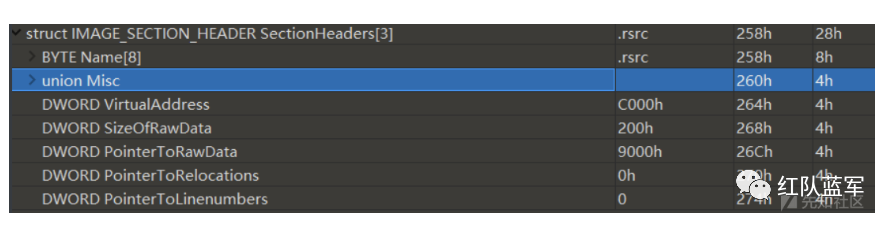 根据PE文件的结构知识,一个节区的具体大小是由IMAGE_SECTION_HEADER中的成员数据来决定的,所以要先找到最后一个节区的节区头如下: