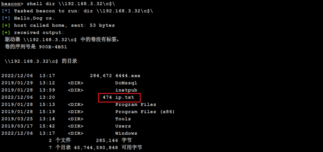 这里如果在实战中,如果想要查看文件内容和文件是否上传成功的话,就要使用上篇文章内网移动-IPC中的type和dir命令