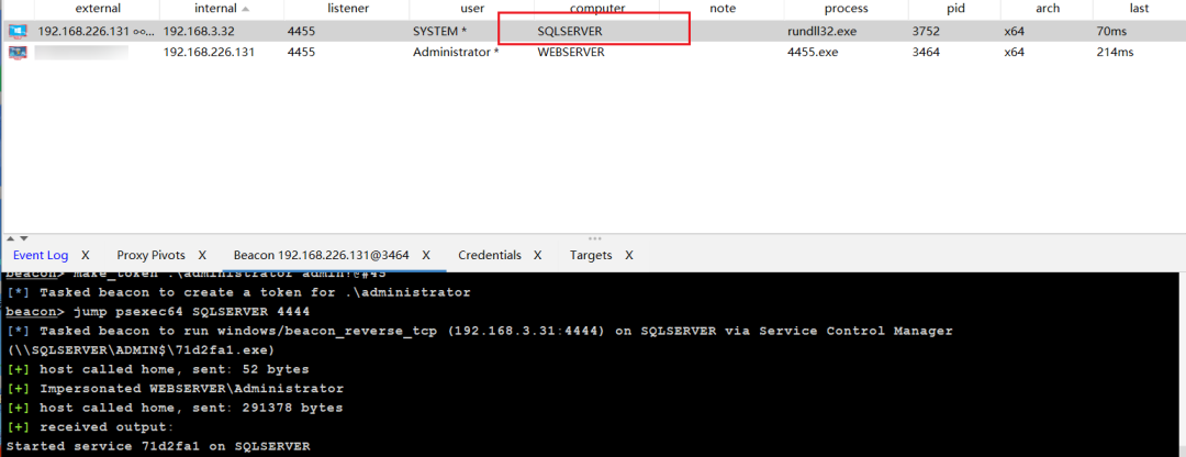 可以看到在MSF中运行了该文件后,成功将sqlserver的shell反弹了过来,在此我们可以直接让其下载后门并执行,上线到我们的CS中。