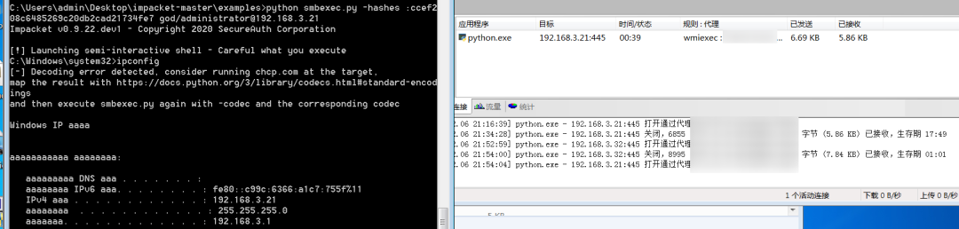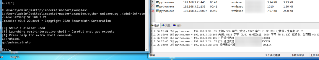 配置好socket代理与规则后,就可直接在本机中调用wmiexec.py文件对其内网进行wmi利用