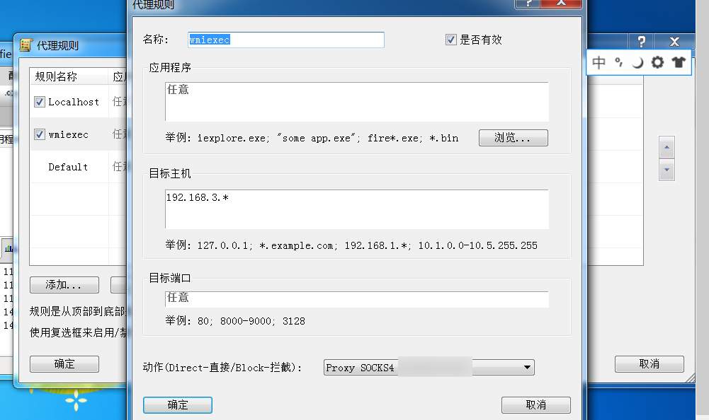 impacket套件中的wmiexec同样可对WMI进行横向移动,并且支持交互式与单执行,支持hash进行传递,相对来说更为方便,这里直接使用它的py脚本配合socket代理就可以对其内网进行横向移动,避免了上传文件等敏感操作。首先设置好Socket代理,与proxifier的代理与代理规则