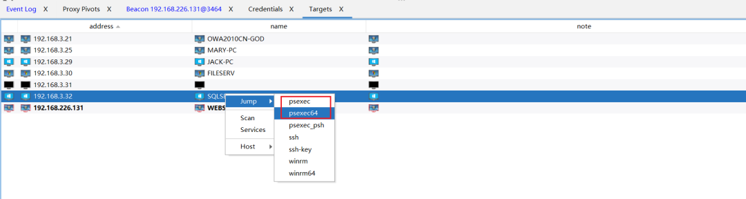在我们的CS中其实也有PSEXEC利用功能,且利用较为方便与简单,在targets中选中目标右键即可弹出利用选项,且支持hash的移动
