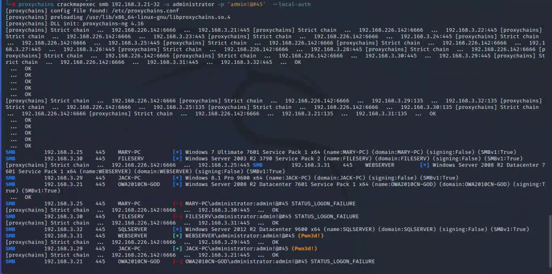 proxychains crackmapexec smb 192.168.3.21-32 -u administrator -p '[email protected]#45' --local-auth