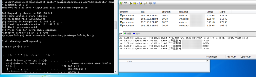 还有一个psexec就是我们的impacket套件中的工具,官方psexec有诸多限制,如不支持hash、cs、msf无法利用成功等问题,所以这里选择使用impacket中的psexec工具就相对来说比较灵活,同样,为了避免发送上传文件时数据丢失或被查杀等问题,我们可使用socket+psexec.py对其内网进行横向移动。socket配置此处不再描述,这里直接使用impacket-Psexec.py进行利用