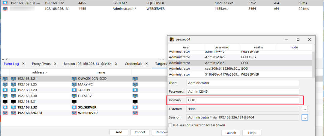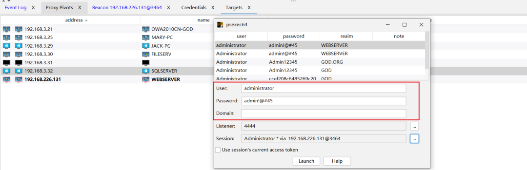 点击psexec64后,就会让我们选择用户名密码与所登录域等,这里我们直接选择之前我们在跳板机中所收集的密码,Domain置空的话为本地用户登录,输入域名后则为域用户登录,选择监听器和会话之后,点击Launch即可。