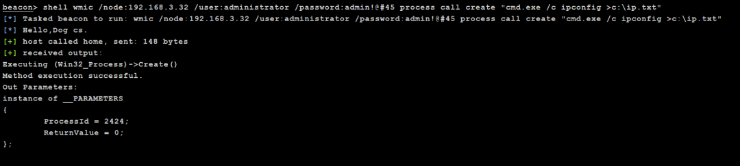 wmic /node:192.168.3.32 /user:administrator /password:[email protected]#45 process call create "cmd.exe /c ipconfig > c:\ip.txt